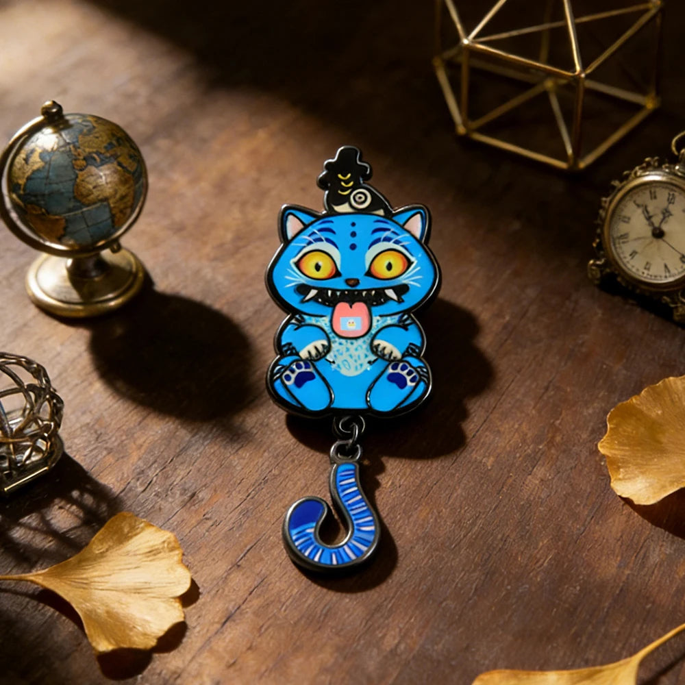 This cute blue tiger enamel pin features a mischievous expression and flowing tail, giving it a whimsical magical look. Perfect for adding personality to jackets, backpacks, tote bags, and pin boards.